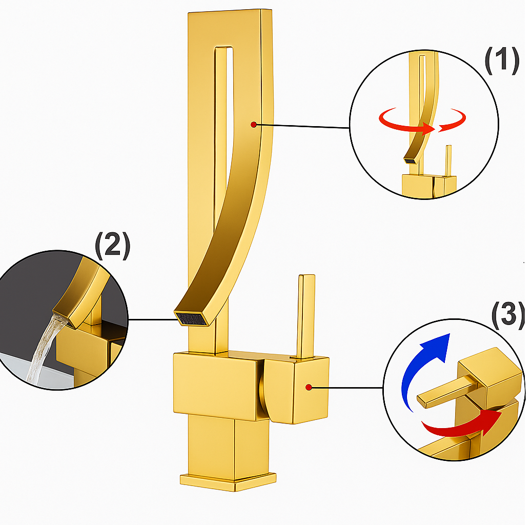 Obrotowy kran i płynna regulacja temperatury i mocy przepływu wody.
