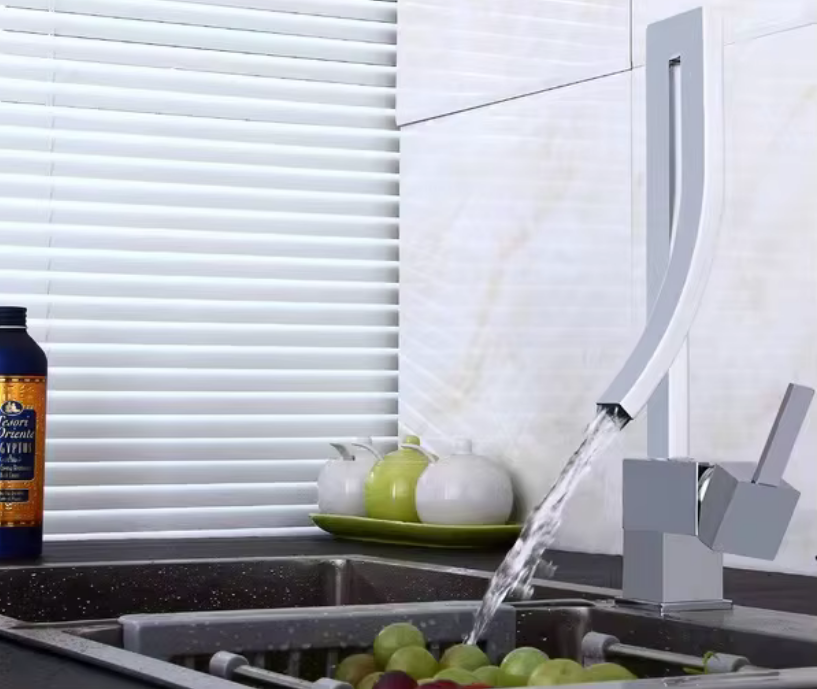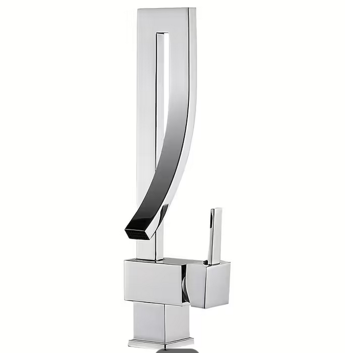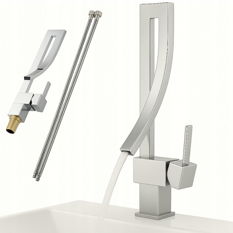 ◼ Designerski kształt – bateria w formie wysokiego łuku z otwartą wylewką przypomina rzeźbę. To rozwiązanie, które sprawia, że Twoja łazienka wygląda jak wnętrze z katalogu.